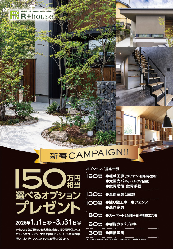 R+houseをご契約のお客様を対象に150万円相当のオプションをプレゼントするお得なキャンペーンを実施中!