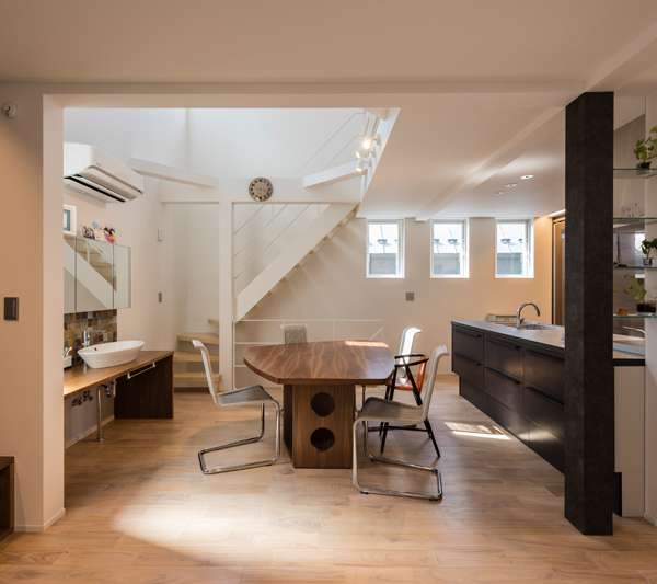 洗面台をダイニングに設置するなど、水回りを出来る限りコンパクトにする工夫でゆとりのLDKを実現。