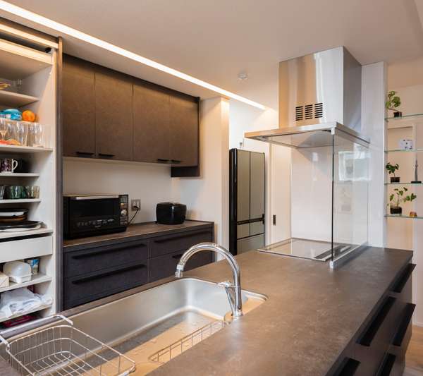 奥様がショールームでひと目惚れしたアイランドキッチンの背面には大容量の収納を確保。脱衣室・洗面室に続く家事動線も便利です。