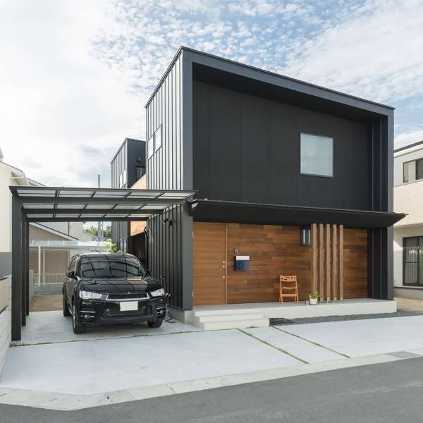 白っぽいライトカラー系の住宅が多い街並みの中で、ダークカラーの外観が際立つお住まい。