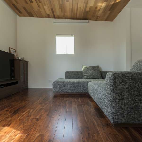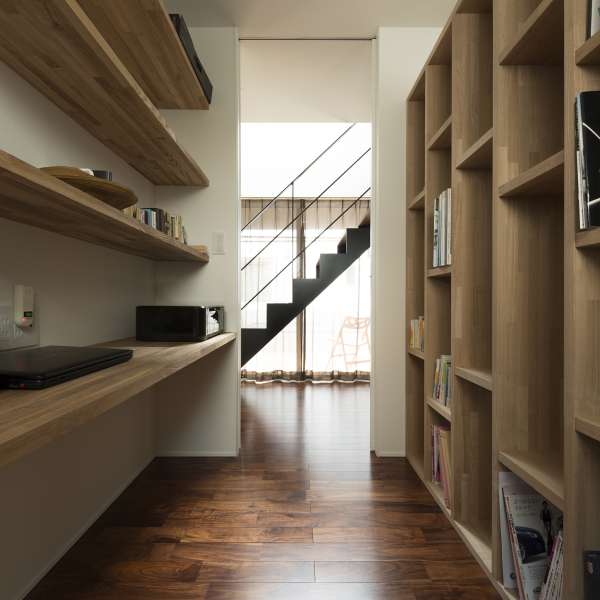 1階は造作の書棚の奥に寝室を配置。奥まった隠れ家調の雰囲気がうれしい、家族一人ひとりがリラックスした時間を過ごせるプライベートゾーンです。
