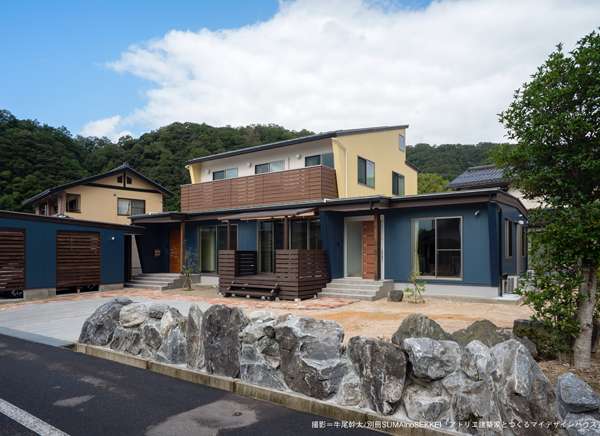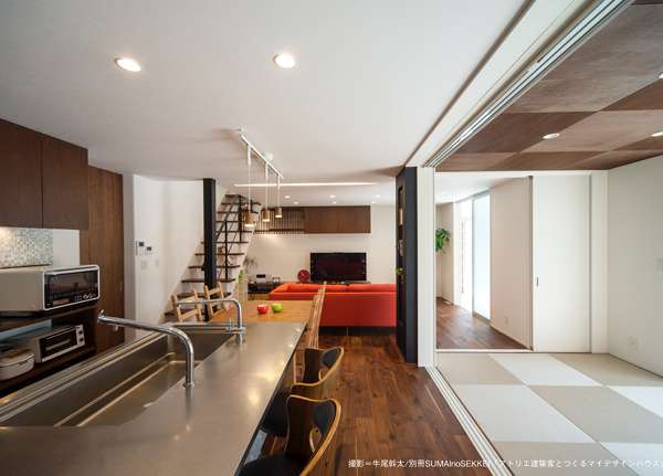 10年先の生活を見つめた共働きの若いご夫婦に、アトリエ建築家が提案したのが親世帯は平屋、子世帯は2階建ての左右振り分けのプラン。