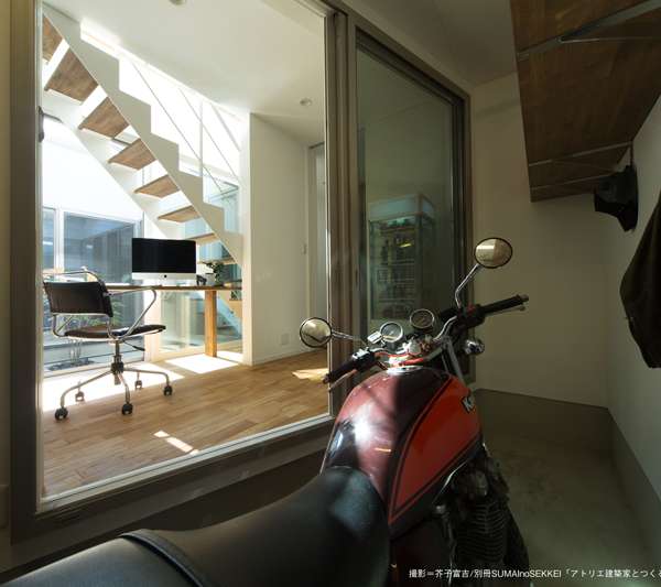 多趣味なご主人のためのクルマやバイク、アウトドア用品が置けるインナーガレージ。階段下の作業部屋は、ガレージからリビングまで見渡せるお気に入りのスペースです。