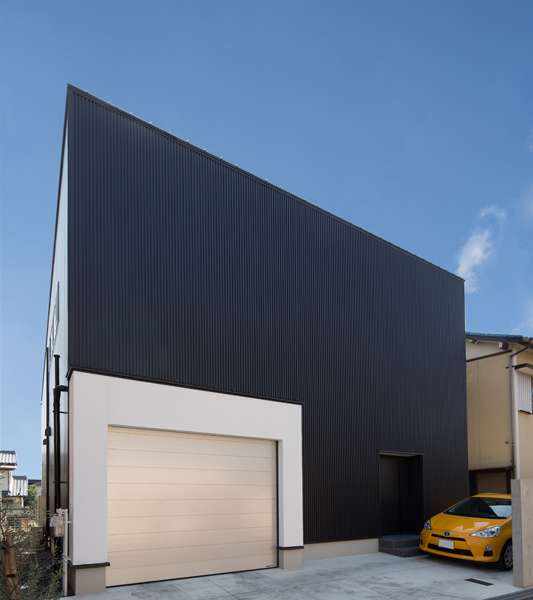 窓ひとつないファサードは、ガルバリウム鋼板の黒い外壁にオーバースライダー型の白いガレージの2色だけに絞った、シンプルで洗練された印象。