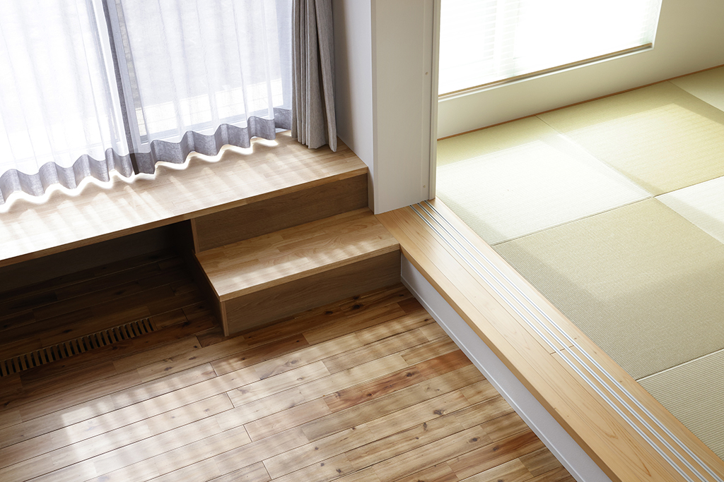 ・ベンチ状になったリビングの窓辺にはステップを設けて、テラスへの出入りをスムーズに。