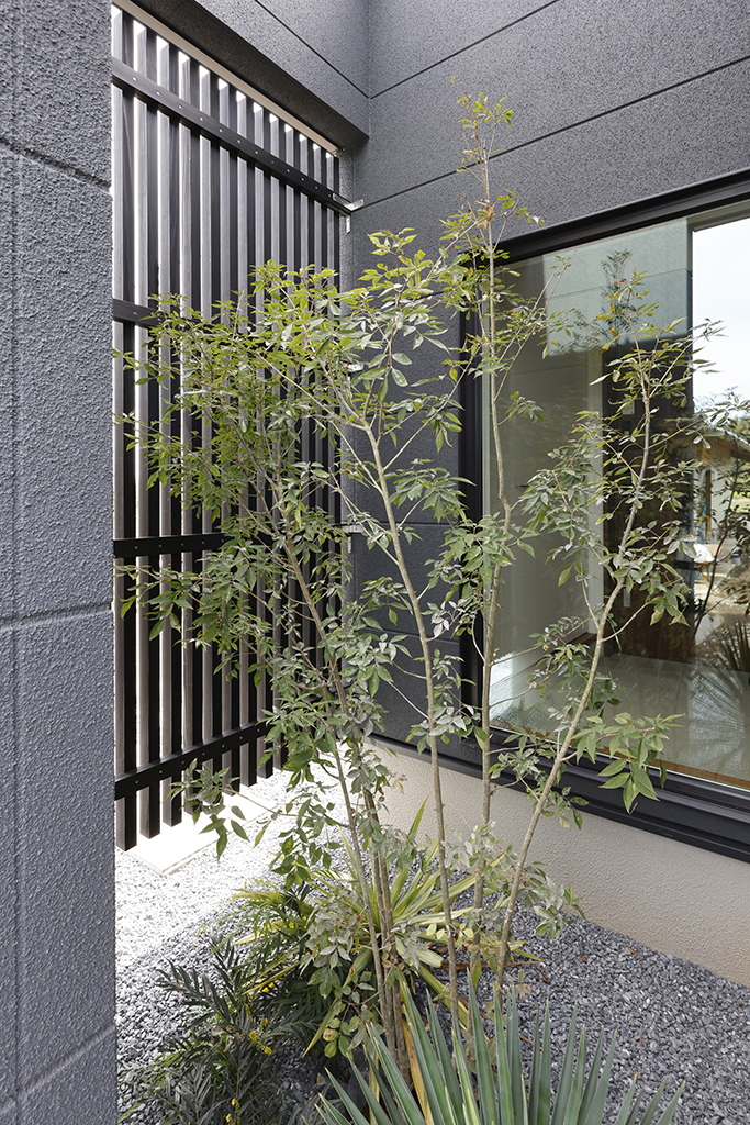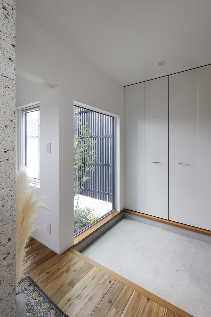 ・玄関に入ると、ガラス越しに坪庭の植え込みが目に飛び込むホールは、旅館をイメージしたデザイン。