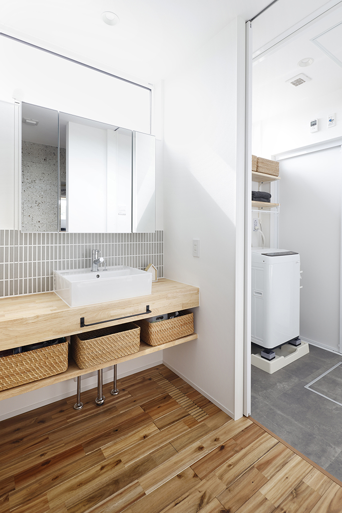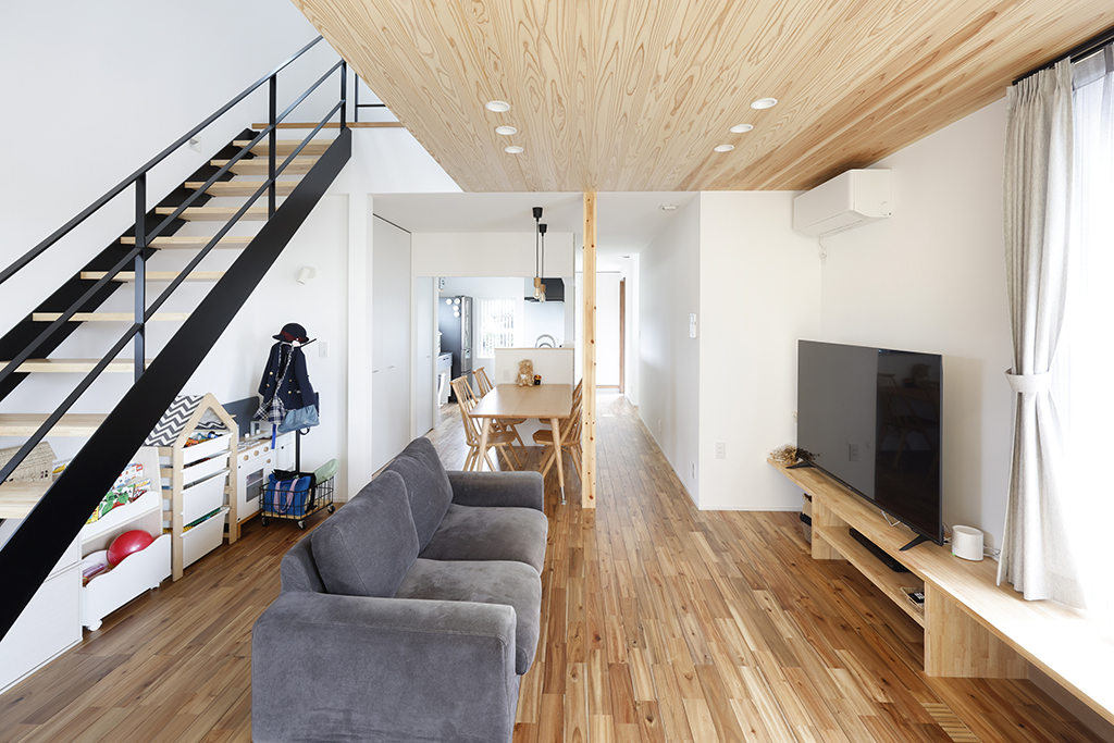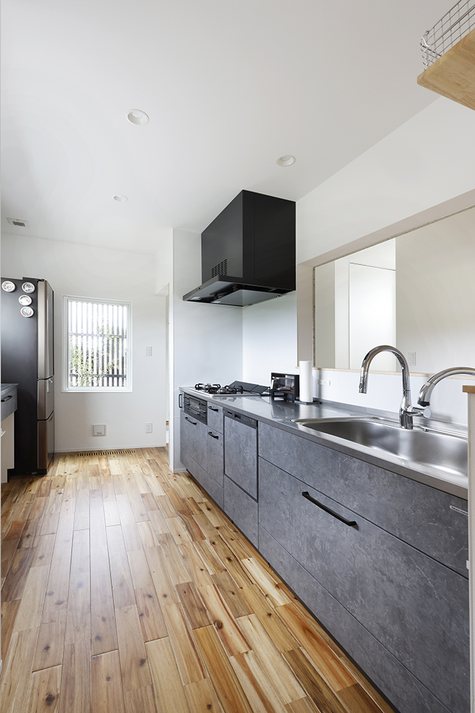 ・直線上に並ぶキッチンとダイニングテーブルの周りは回遊動線で機能面も充実。