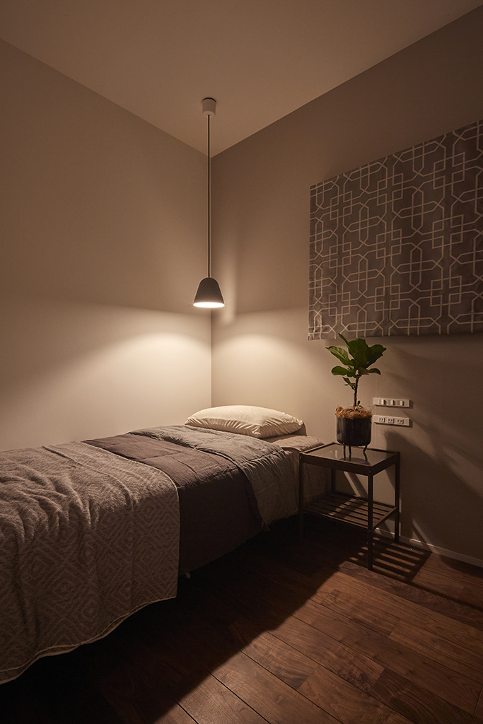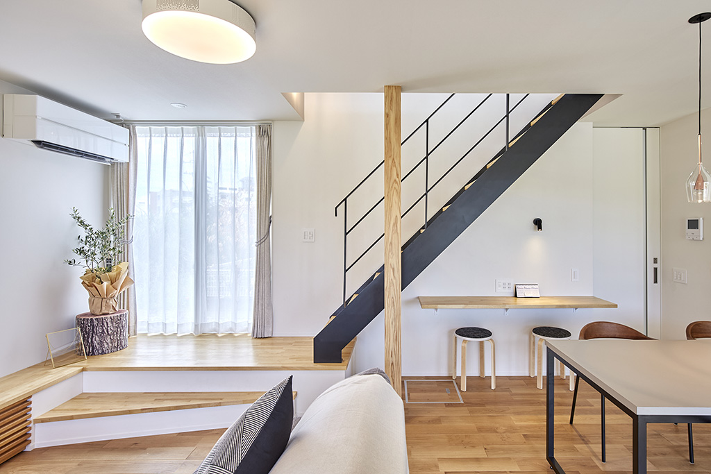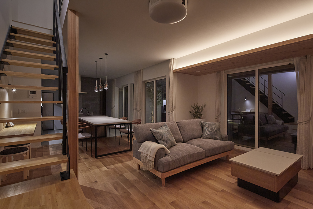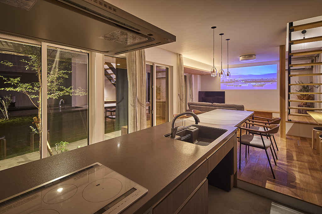 ・リビングの一面にはあえて窓を設けず、壁面全体を大きなスクリーンとして活用。