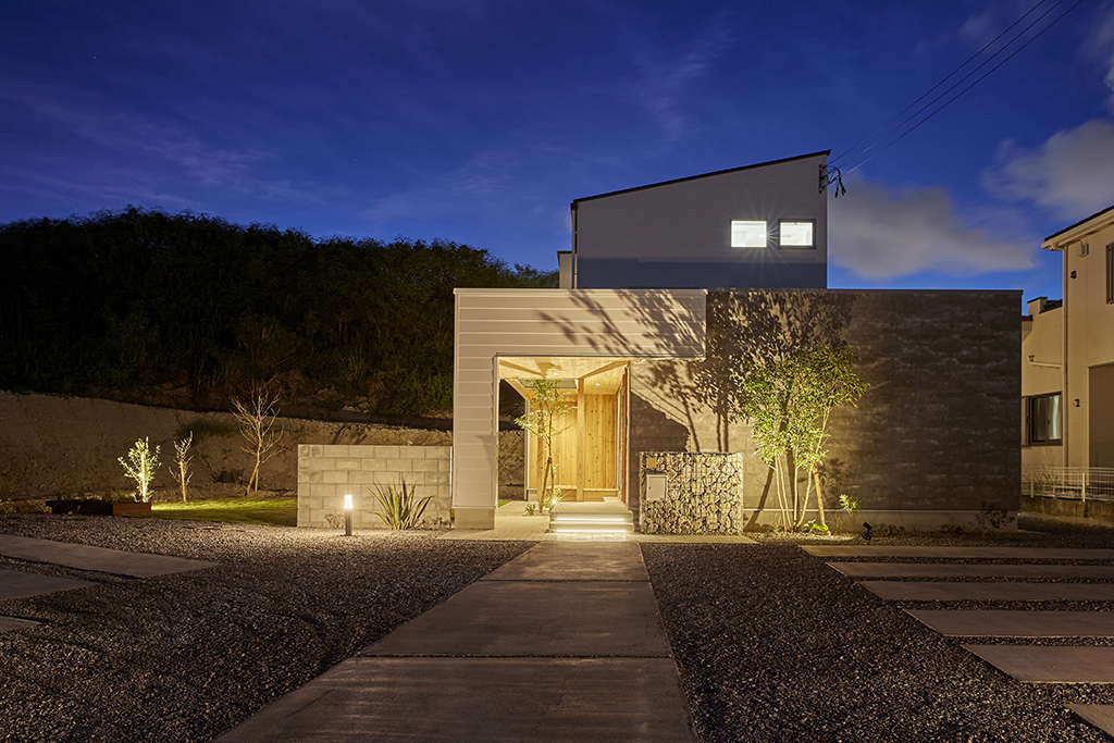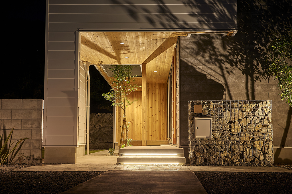 ・アプローチを進むと、建物を彩るガビオンとシンボルツリーがお出迎え。