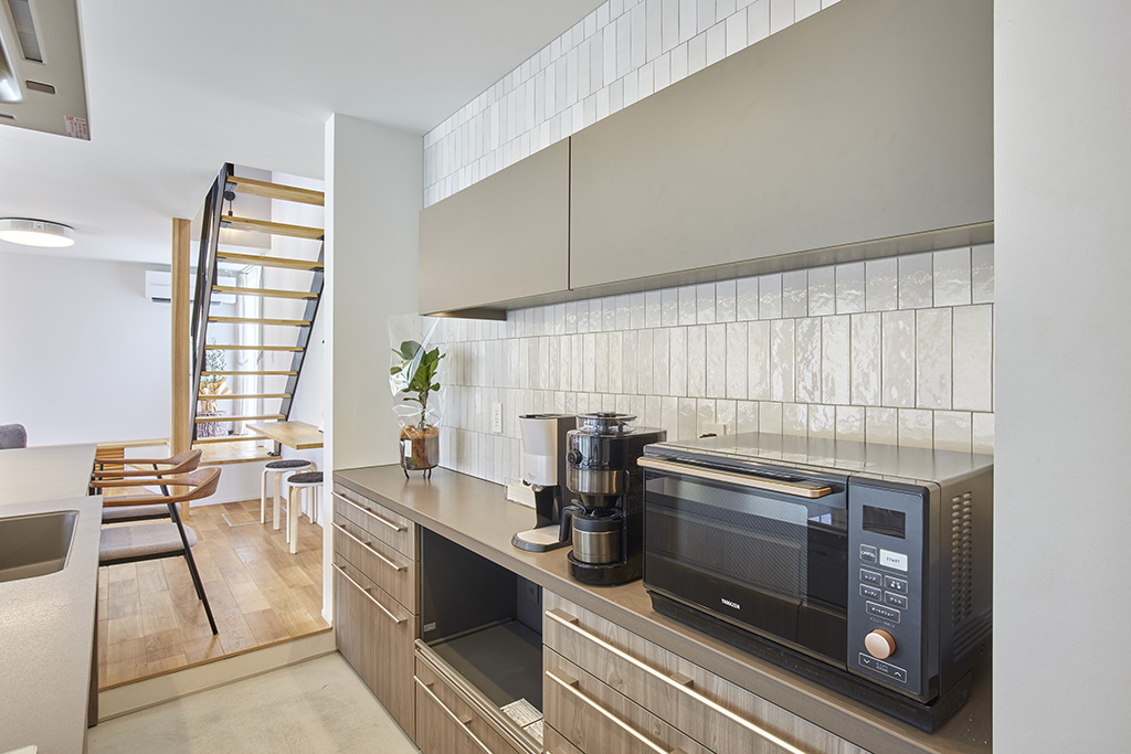 ・キッチンのバックセット側には陶磁器のタイルを使用し、上品な見栄えに。