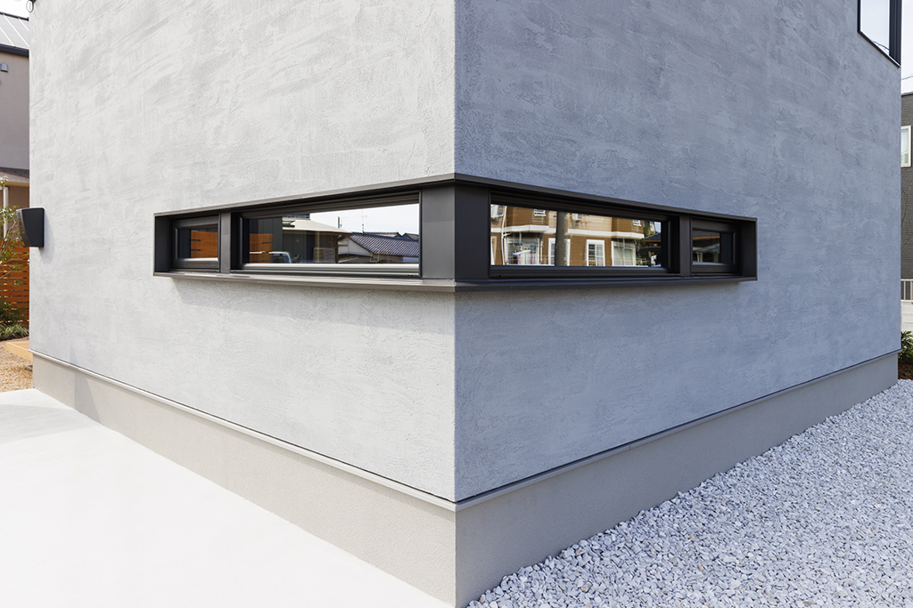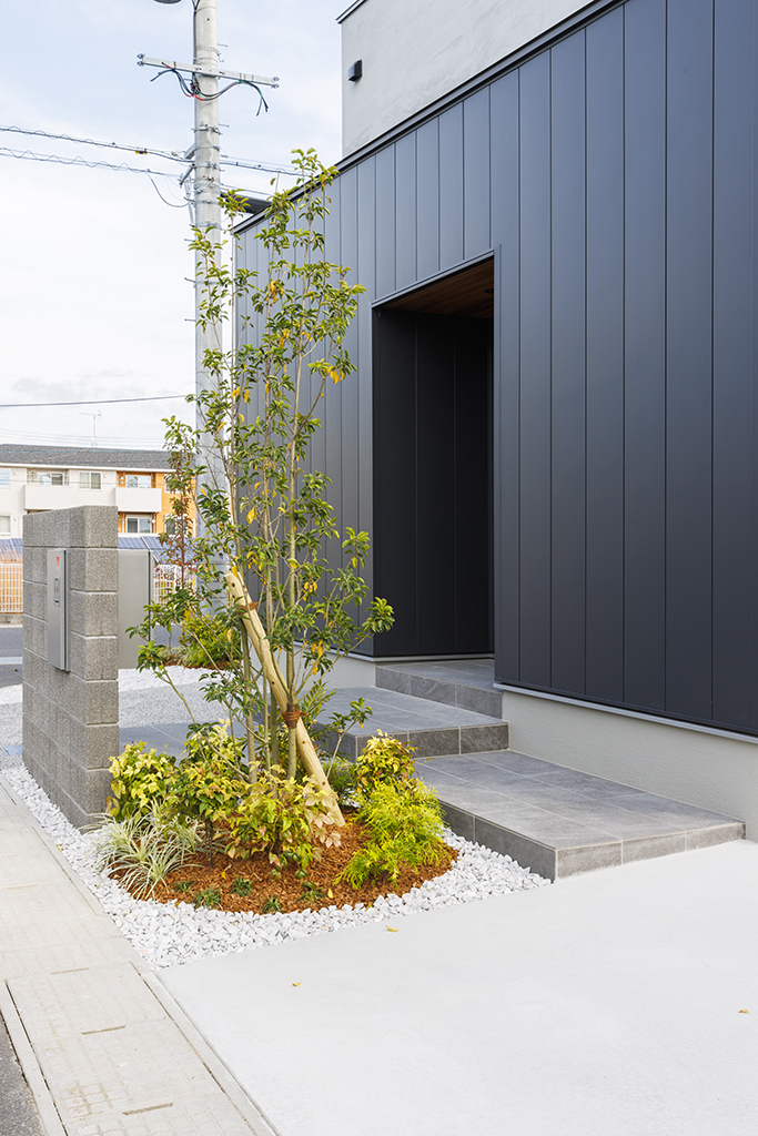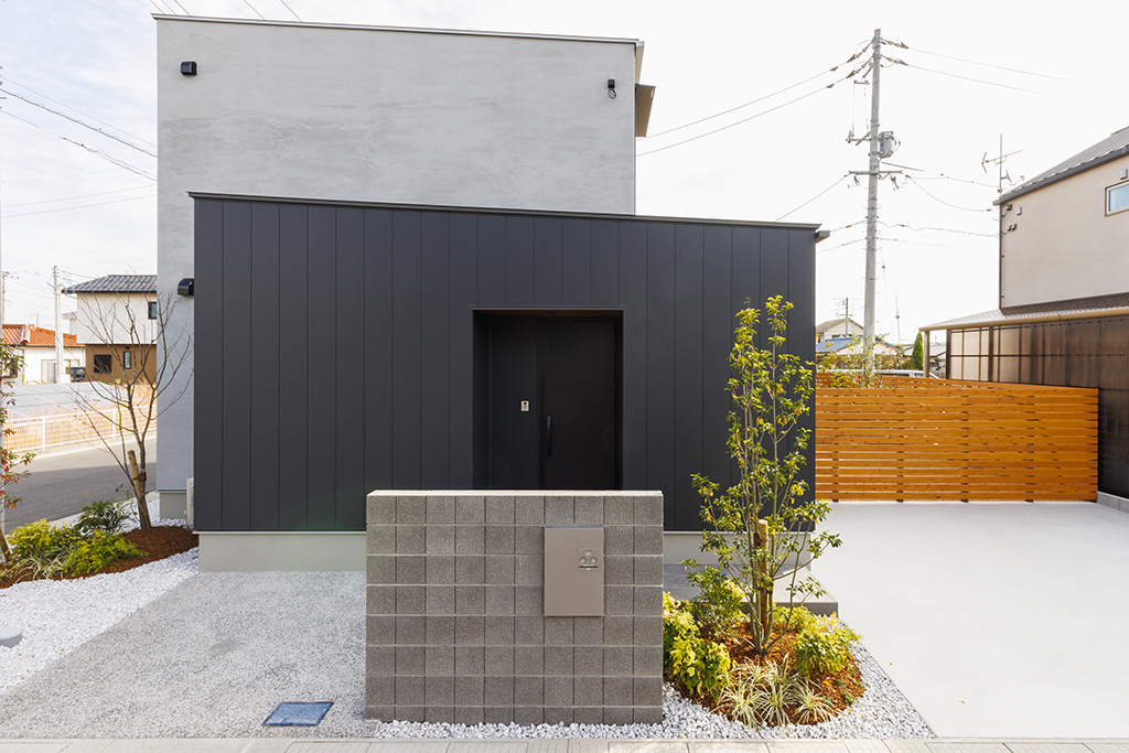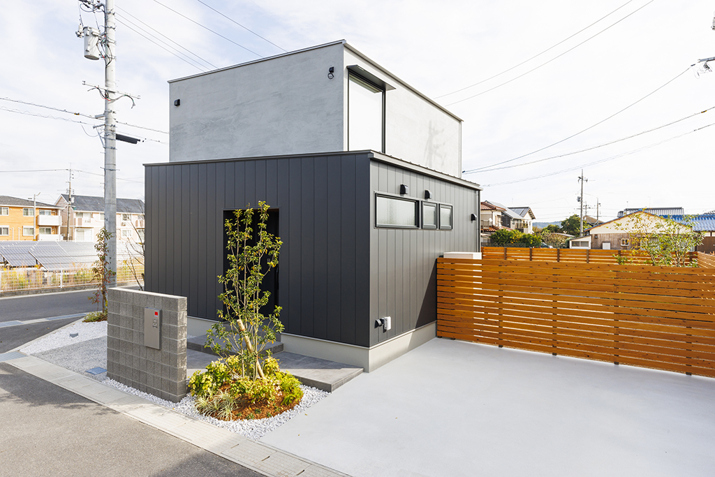 ・黒とグレーのコントラストが美しい、洗練された佇まいの外観。