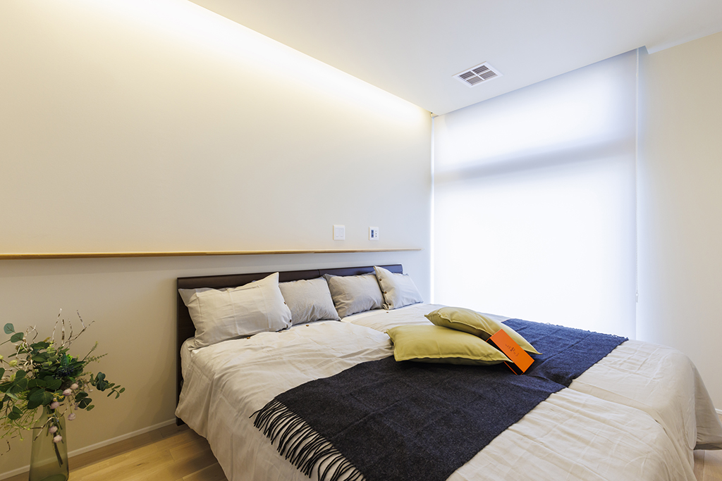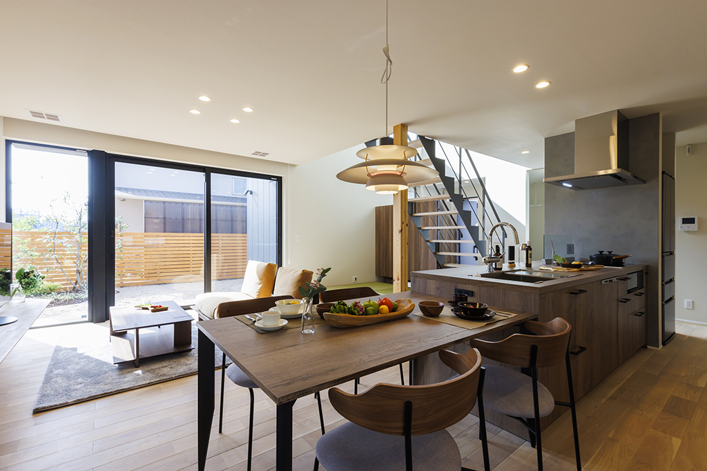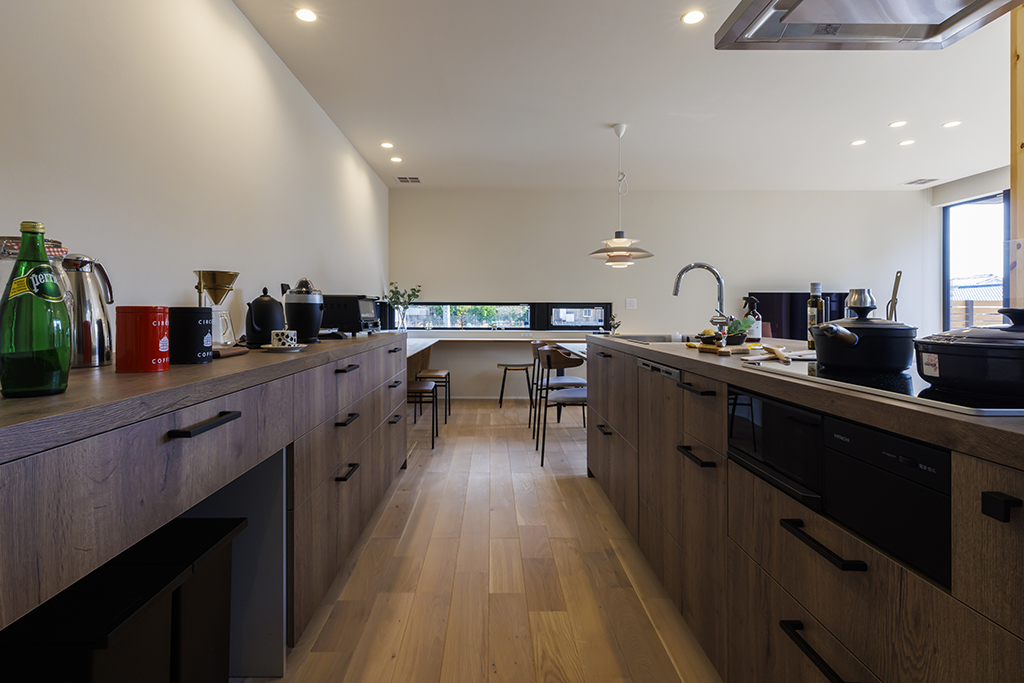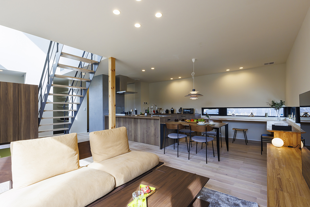 ・テレビボードからキッチンへとつながるL字型カウンターが空間に一体感を生み、小窓が外観のさりげないアクセントに。