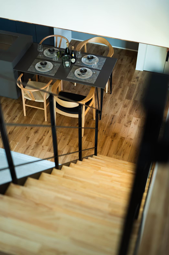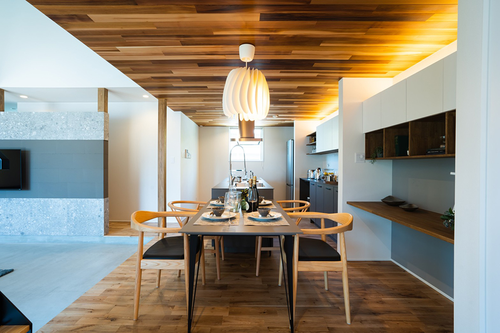 ・キッチンとダイニングは天井をリビングより低くすることで落ち着く空間に。