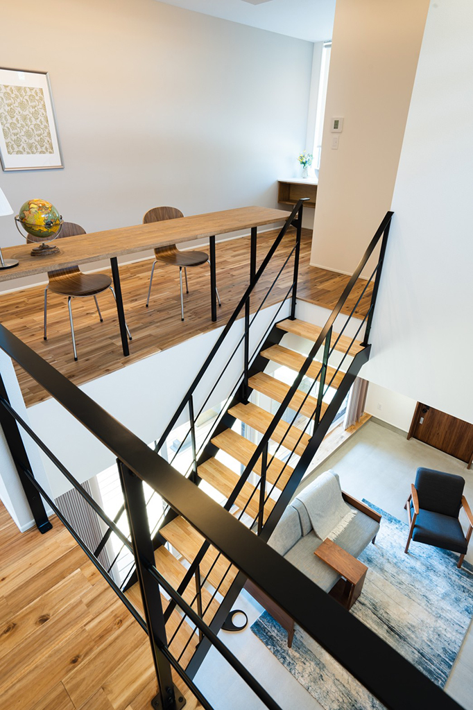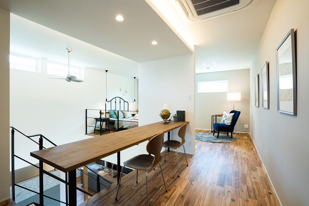 ・吹き抜け部分には仕事や勉強に利用できるワークスペースを配置。