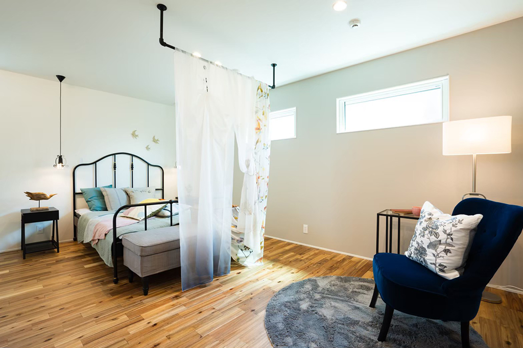 ・2階の寝室は、将来的に間仕切りをして使用できるように設計されている。