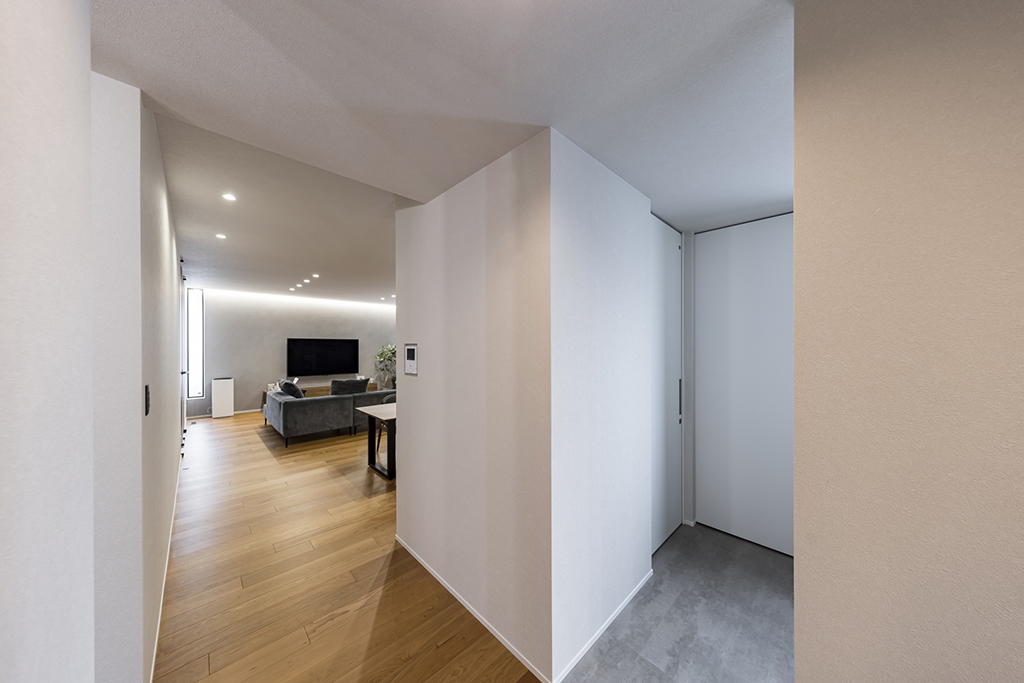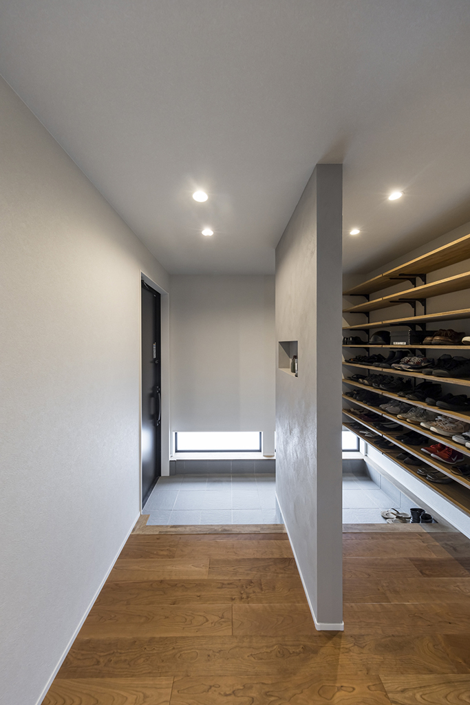 ・目隠し付きのシューズクロークは、来客時も生活感を隠して安心感を保つ。
