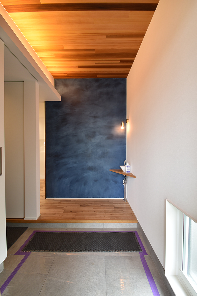 ・印象的なブルーの壁が玄関スペースのアクセントに。