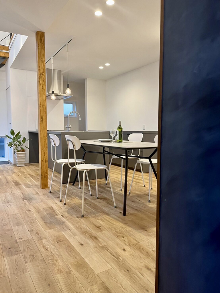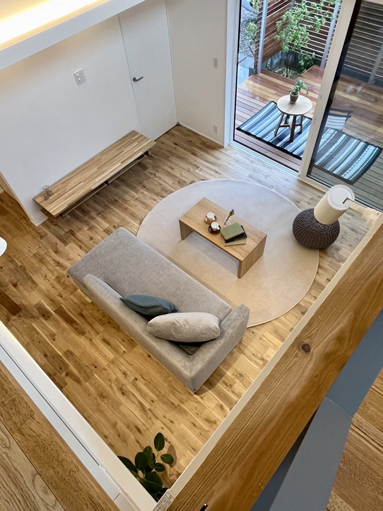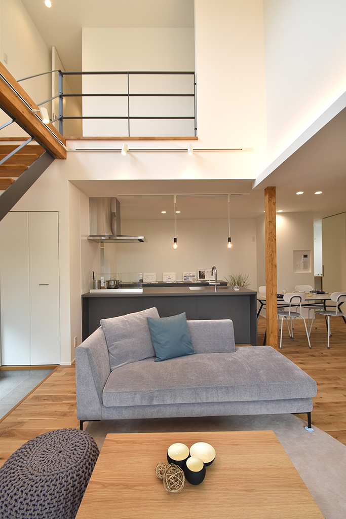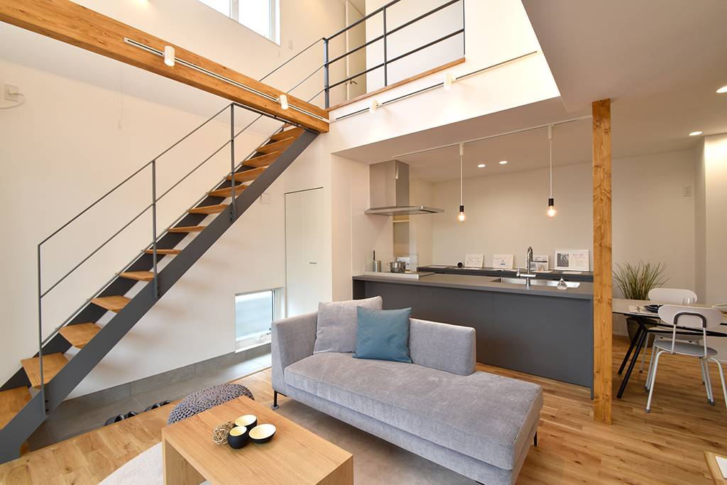 ・吹き抜けとスケルトン階段が、LDK全体に視覚的な広がりを生み出す。