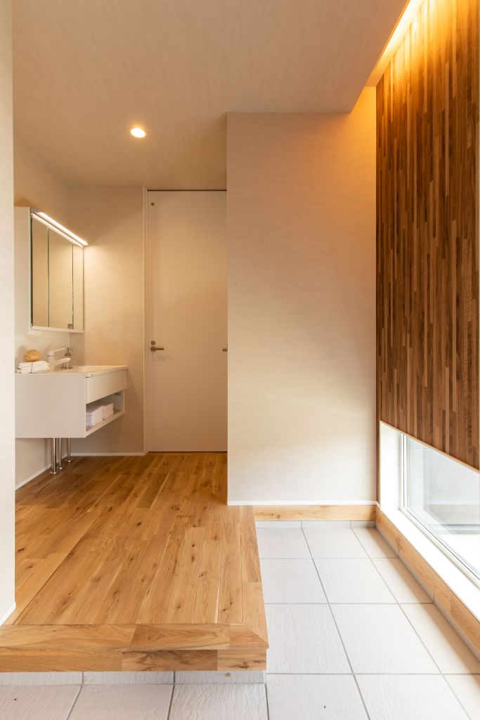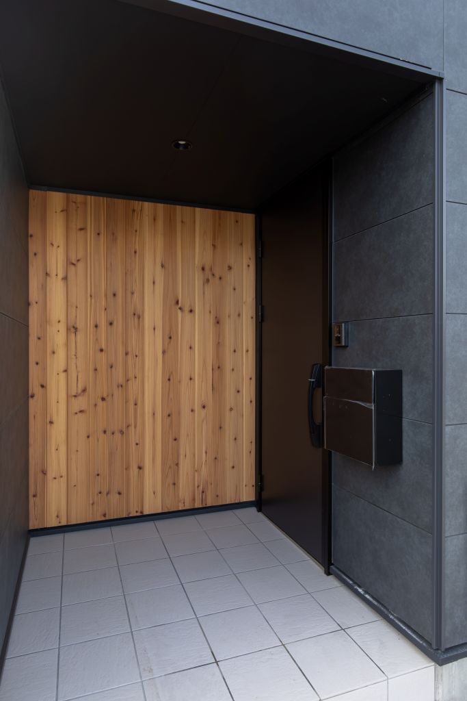 ・玄関ポーチにはシンプルな外観に映えるアクセントとして杉材を採用。