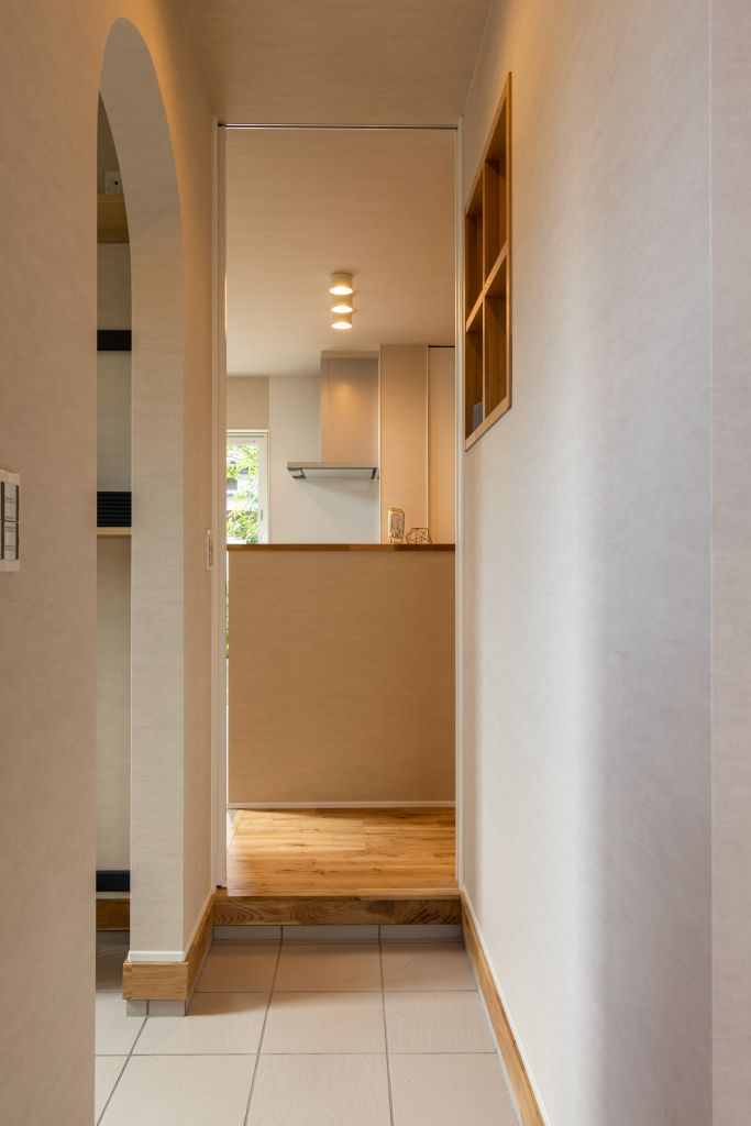 ・光をしっかり取り込む玄関の地窓からは、花壇スペースの草花を眺めることもできる。