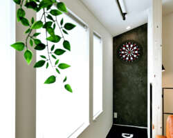 ・リビング横に設けた趣味のダーツスペースは、雨の日に室内干しとしても活用できる機能的なエリア。