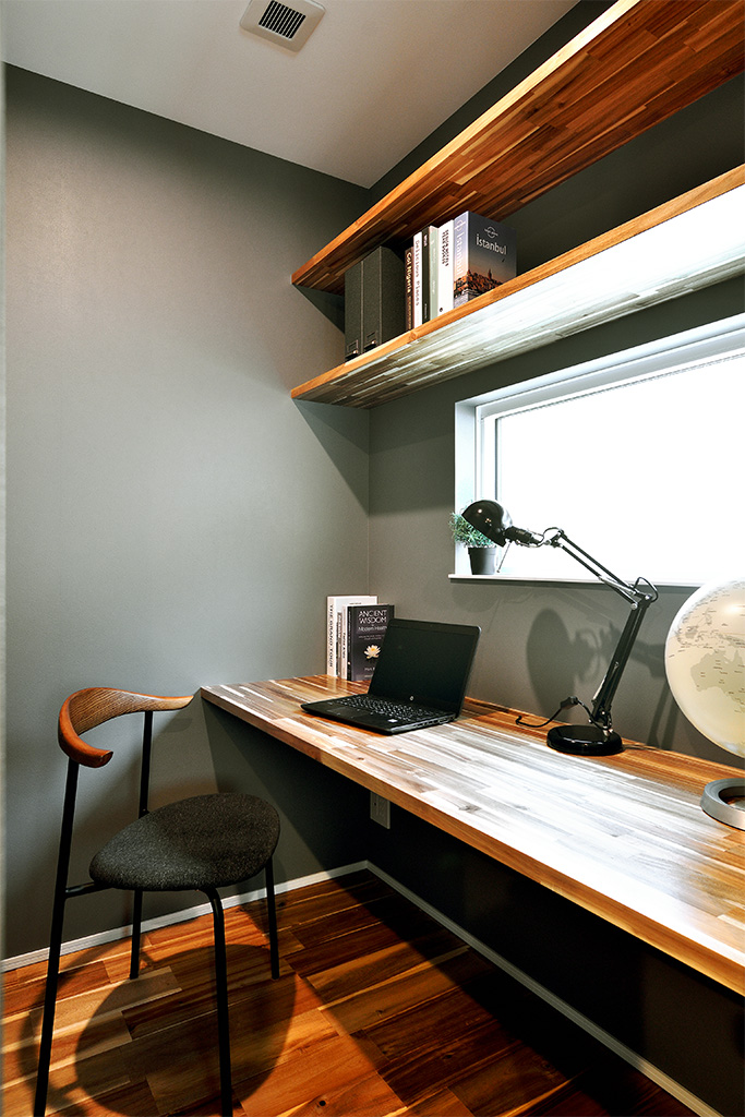 ・リビングにロングカウンターの勉強机を配置し個室はコンパクトに。