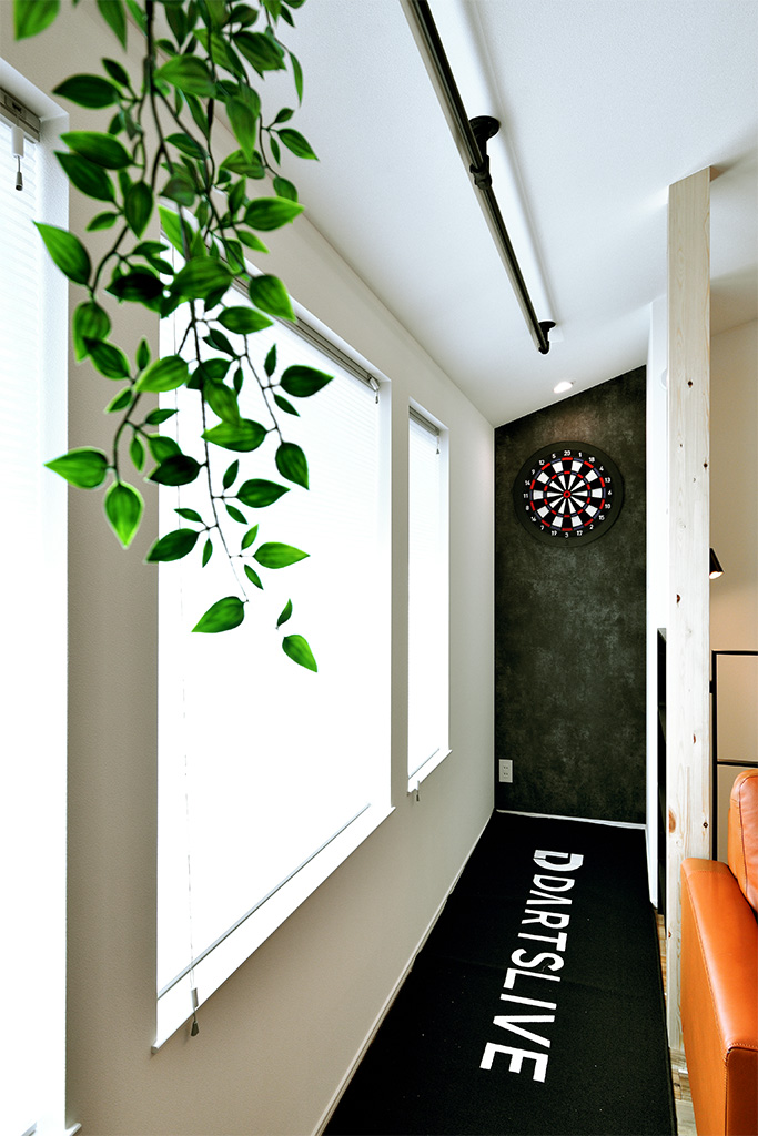 ・リビング横に設けた趣味のダーツスペースは、雨の日に室内干しとしても活用できる機能的なエリア。