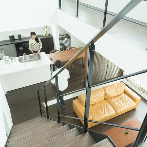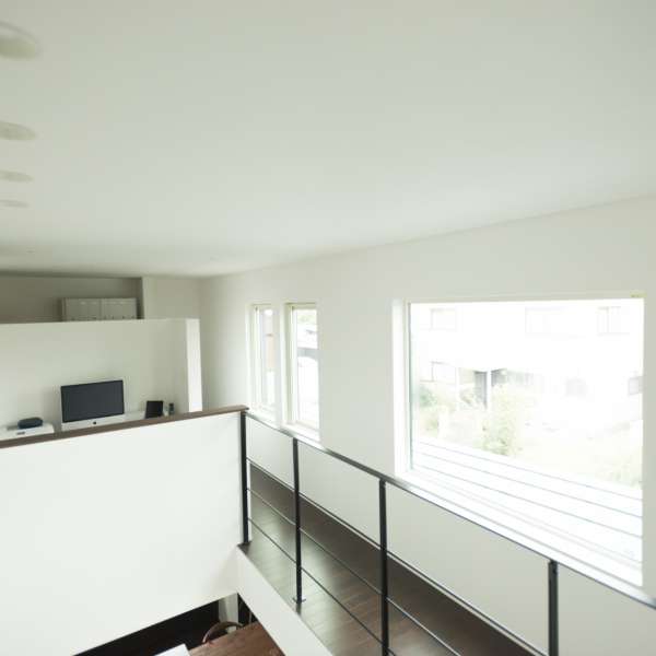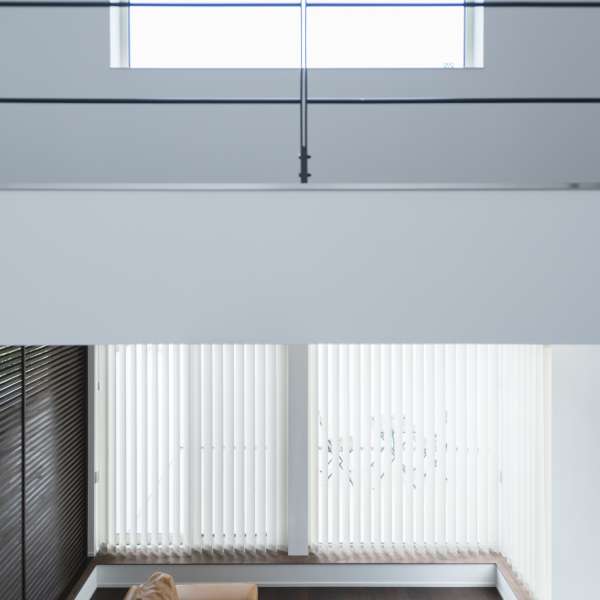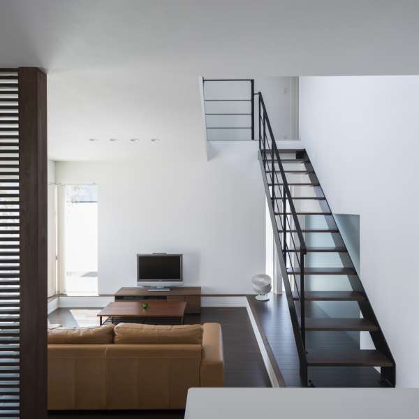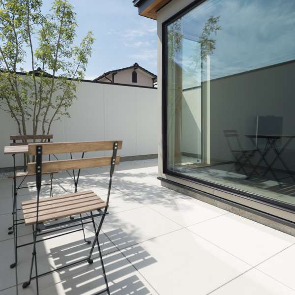 一段下げる工夫で、庭や白いテラスを眺めやすくしたリビング。室内のつながりを曖昧にすることで、広がりとくつろぎを創出しました。