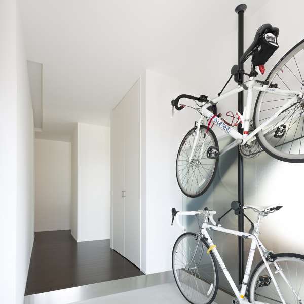 玄関ホールには、ご夫妻共通の趣味のロードバイクを簡単に収納できる専用ハンガーを設置。