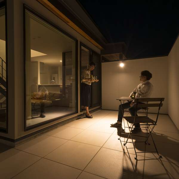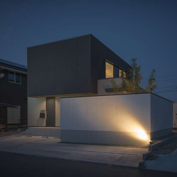 ご主人が思い描いていた無機質なイメージをカタチにした、ボックス型のモダンな外観。夜はライトアップでドラマチックに演出されます。