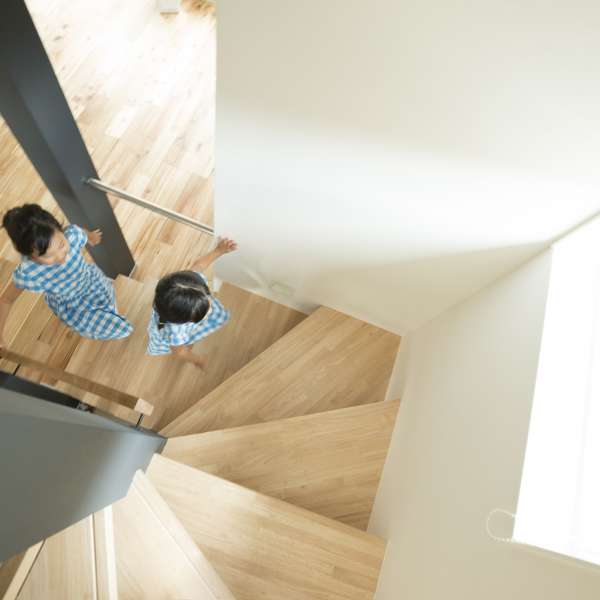 2階から3階へのまわり階段には開放的な吹き抜けを設置。子ども達の格好の遊び場になっています。