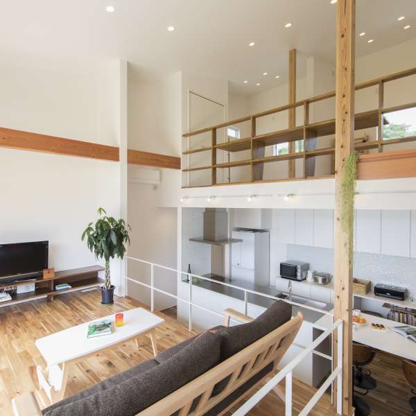 リビングは吹き抜けで2階と大空間を共有しています。本物の素材にもこだわり内壁は漆喰にしました。