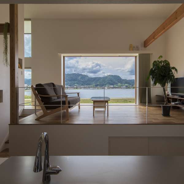 キッチンからは湖が一望できるように、90㎝ほどリビングの床を高くしました。