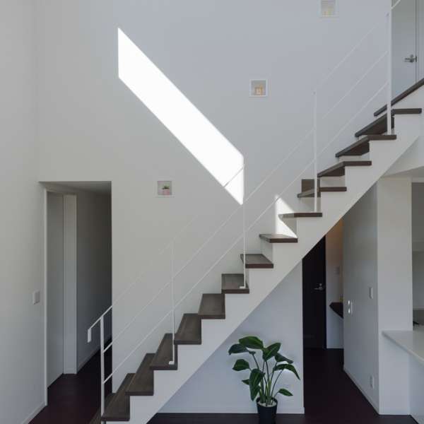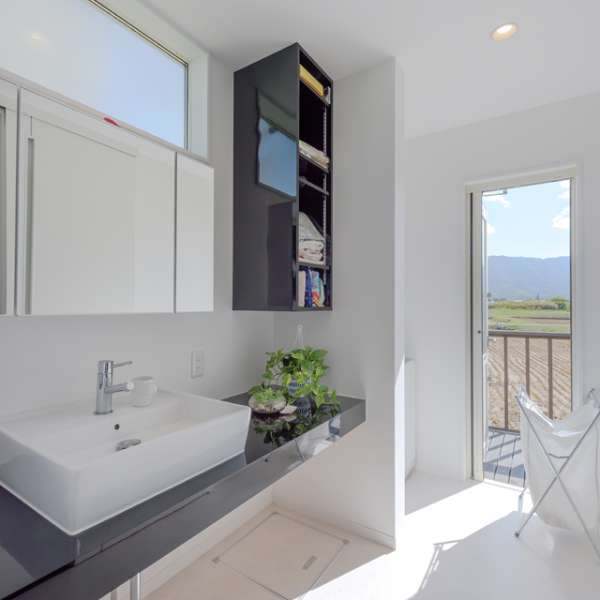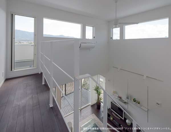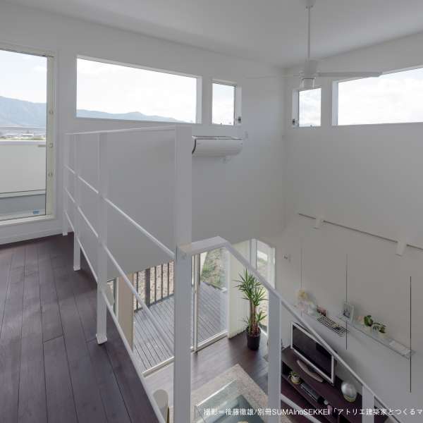 ◎吹き抜けの高い位置に、横に長く配置された高窓からは、遠くの山並みがパノラマのように見渡せます。