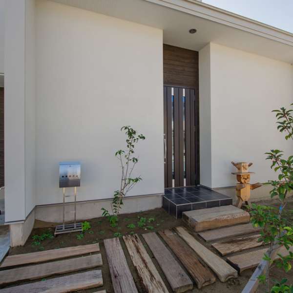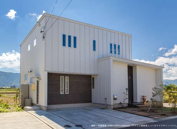 ◎スリットの連窓と板張りがモダンな印象を添える、箱を組み合わせたシンプルな外観デザイン。