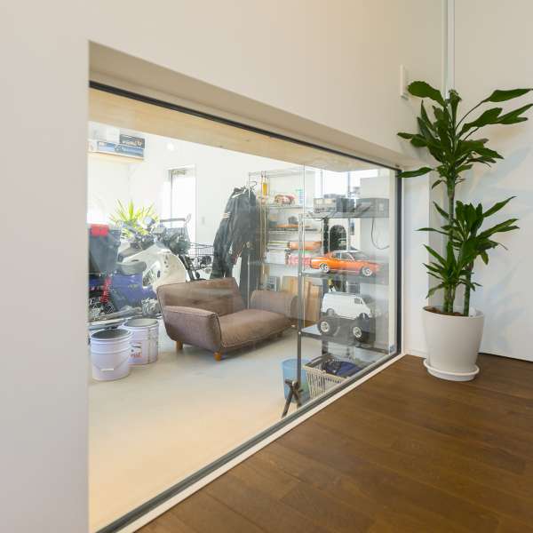 奥様からの要望だったご主人のためのバイクガレージ。そこで建築家はご主人だけの趣味スペースとして切り離すのではなく、玄関からのアクセスを確保したり、ソファーのあるバイクギャラリーとして家族の日常を彩る空間に仕上げました。