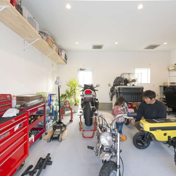 1階はご主人が趣味のバイクに没頭できるインナーガレージと主寝室。