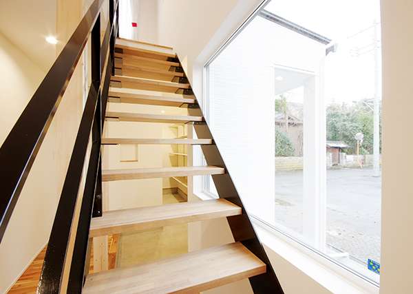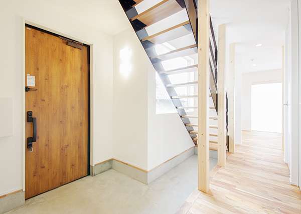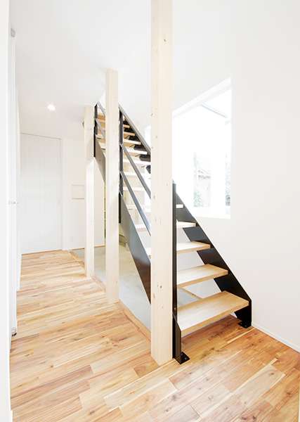 玄関を入ってすぐに設置された鉄骨階段が印象的な間取り。