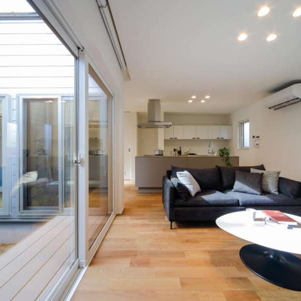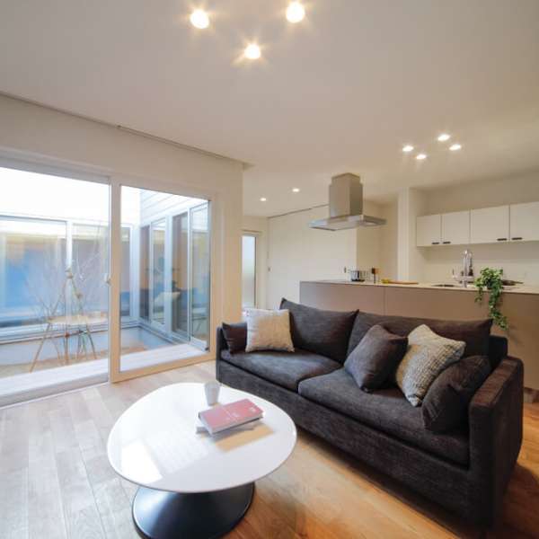 中庭を中心に配置した32帖超の大空間。その中庭によって緩やかに区切られた空間は、
