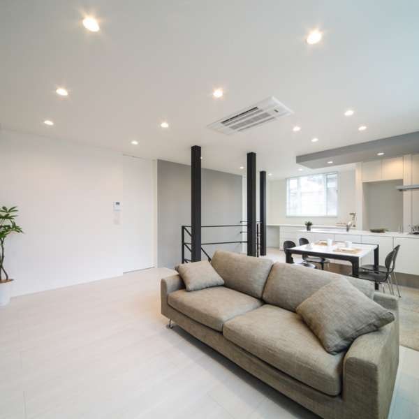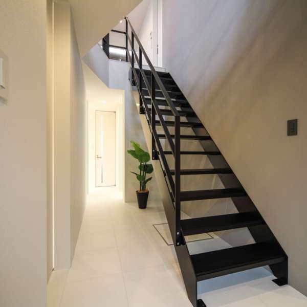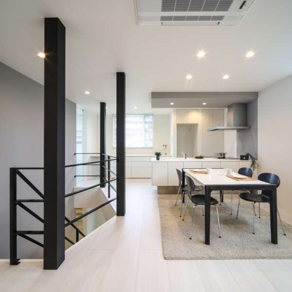 21.7帖のLDKの中央付近に鉄骨階段と吹き抜けを配置。