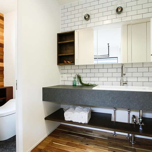 造作した洗面台とトイレの手洗い器は「映え」ポイント。