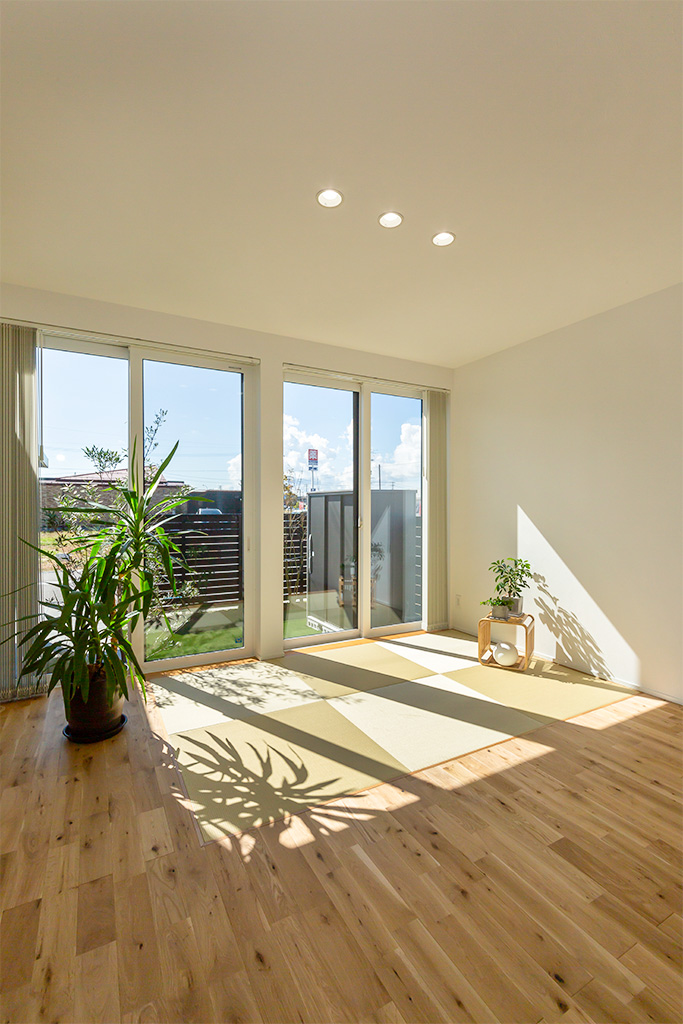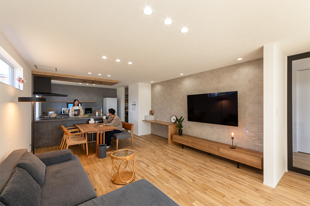 ・LDKは3640mmの間口で庭まで一直線に目線が抜ける、広々とした開放的な空間に。大きなリビングのなかにいつも家族が集い、テーブル、ソファ、スタディカウンター、畳等それぞれが好きな場所で自由に過ごせる設計。