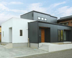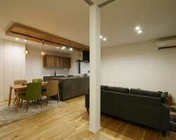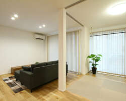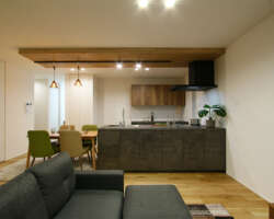 廊下や仕切りをなくし、延床41坪の大空間を無駄なく活用したワンルームのような広い居住空間。大開口のトリプルサッシとダブル断熱による高い気密・断熱性能を実現し、さらに24時間全熱交換型換気システムと太陽光搭載で空調効率をアップ。解放感と快適性を両立した高性能住宅が完成。べトングレーのグラフテクトキッチンでカフェのようなオシャレなLDK。