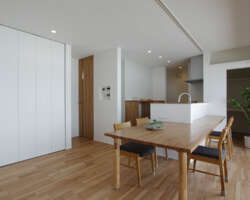 内と外がつながる開放的な平屋。庭とLDKを結ぶウッドデッキは、アウトドアリビングとして多彩に活用可能。大きな窓から注ぐ自然光がリビングを包み込み、田園風景を眺めながらゆったり過ごせる贅沢な空間を演出。キッチン・ダイニング・リビングを効率的に配置し、家族が自然と集まる心地よさと家事ラクな動線を両立。広々としたLDKを中心に、プライベート空間や水回りもバランス良く整えた、暮らしを豊かにする設計。