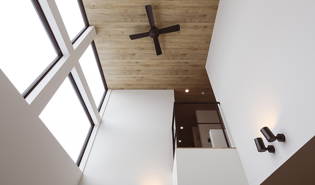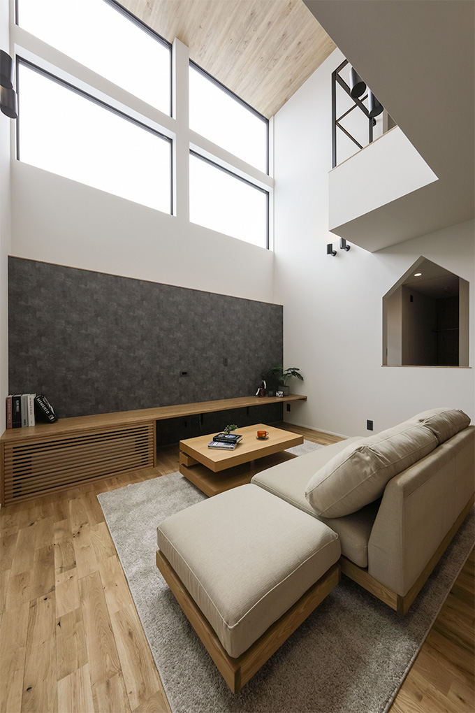 開放感を追求した吹き抜けと大開口の窓、そして間仕切りを極力減らした一体感のあるLDKが魅力。