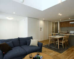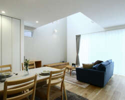室内には、畳スペースを含め約22.8帖の広々としたLDKが広がり、吹き抜けと南面の大開口サッシによって、明るく開放感のある空間が実現されています。