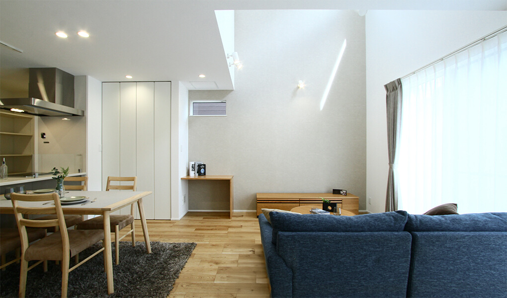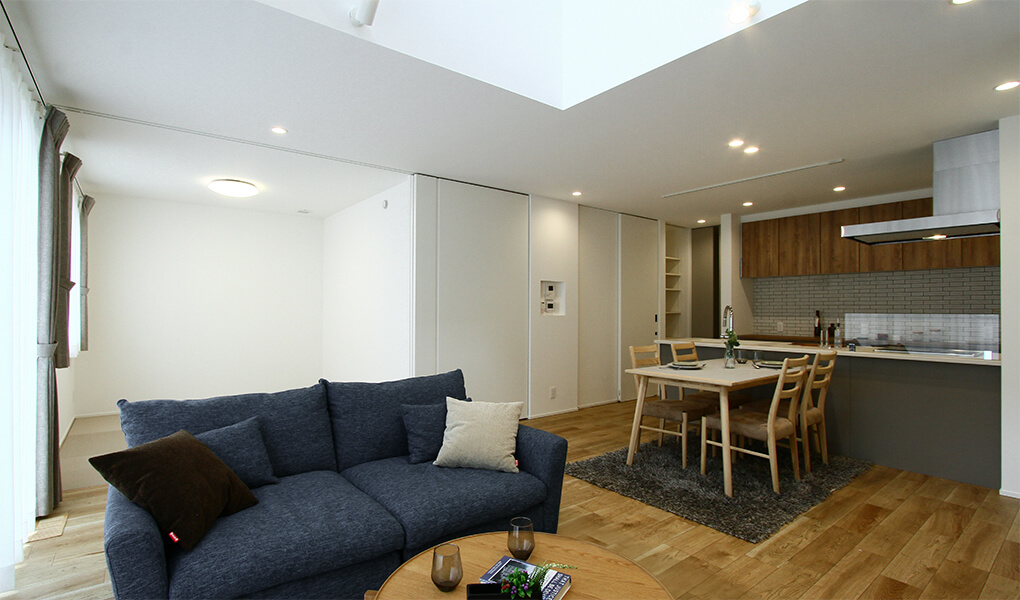 室内には、畳スペースを含め約22.8帖の広々としたLDKが広がり、吹き抜けと南面の大開口サッシによって、明るく開放感のある空間が実現されています。
