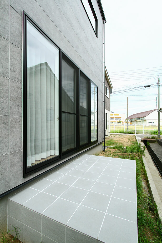 リビングからはタイルテラスへと視線が抜け、室内外が心地よくつながります。