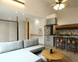 木目の天井が空間に温もりを添え、くつろぎと心地よさを演出します。