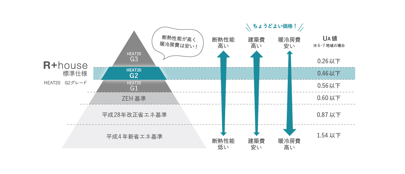 R+houseが大切にするのは、我慢の節約ではなく、家の「高性能」と「設計の工夫」です。高い断熱性・気密性で熱を逃さず、さらに冬の貴重な日差し(太陽熱)を最大限に室内に取り込む「パッシブデザイン」。